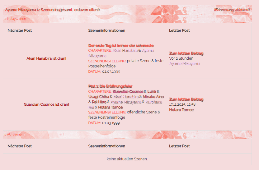 (19.11.2025, 15:32)Guardian Cosmos schrieb: Die Inplayszenen kannst du in deinem Profil finden. Da hab ich die jetzt eingebaut. Außerdem sind die auch in der Seitentabelle zu finden unter Inplayszenen Übersicht. Aber ich muss wohl noch mal schauen, ob ich die in jedem Style eingefügt habe.